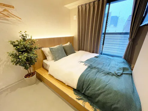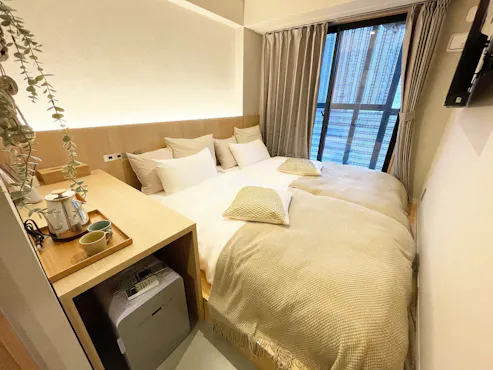 R Hotel Nambaは難波駅から徒歩10分の立地に位置する新築ホテルです。 ライフスタイルに合わせたご利用が可能で、シェアキッチンやコインランドリーなどの設備を完備しています。 客室は和モダンを取り入れたデザインでダブルルーム、ツインルーム、デラックスルームと3タイプのご用意があり、 シングル利用からグループ利用まで幅広いニーズを満たす作りとなっています。 1Fには共用ラウンジもあり、リモートワーカーやビジネスマンの方にも最適な空間を提供しています。 客室の一部はマンスリーマンションとしても提供しており、住空間としての快適性を重視しています。
