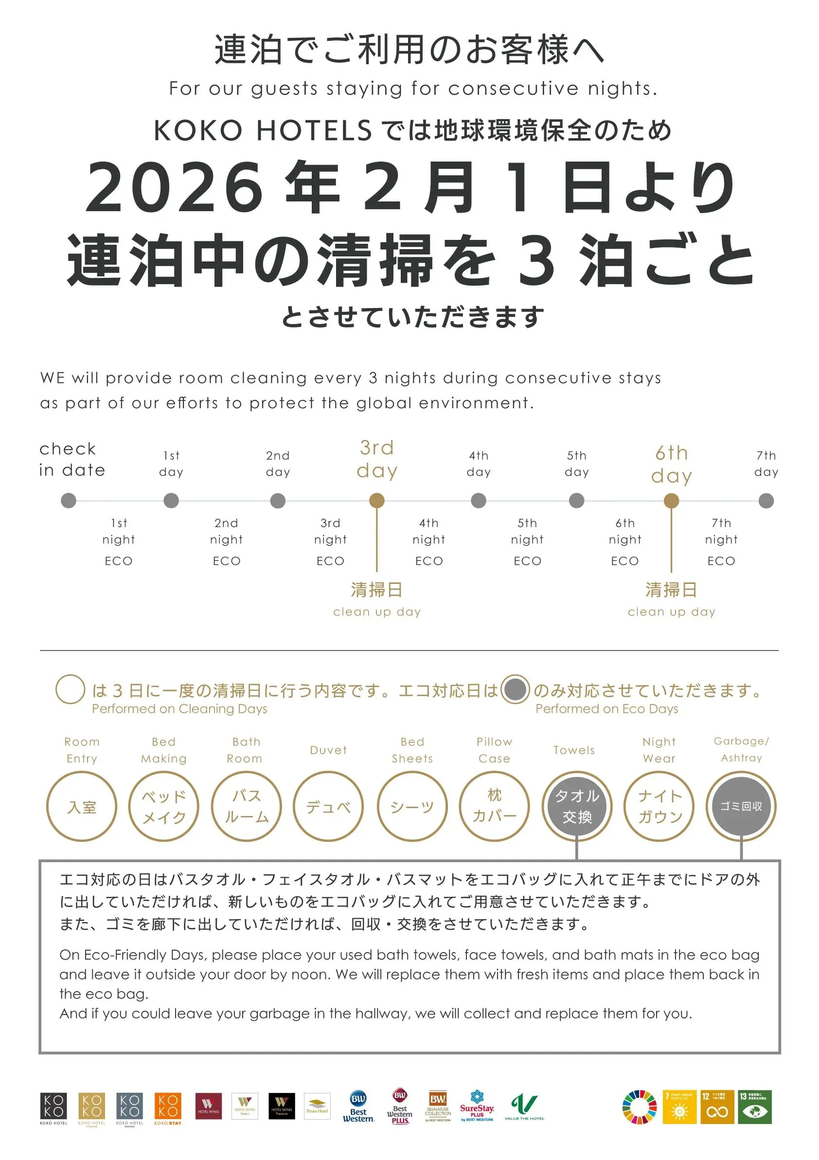 私共では「地球環境保全」のため2026年2月1日(日)チェックインより連泊の方の清掃を「3日に1度」とさせていただきます。