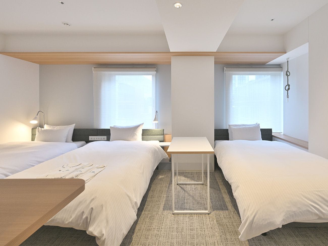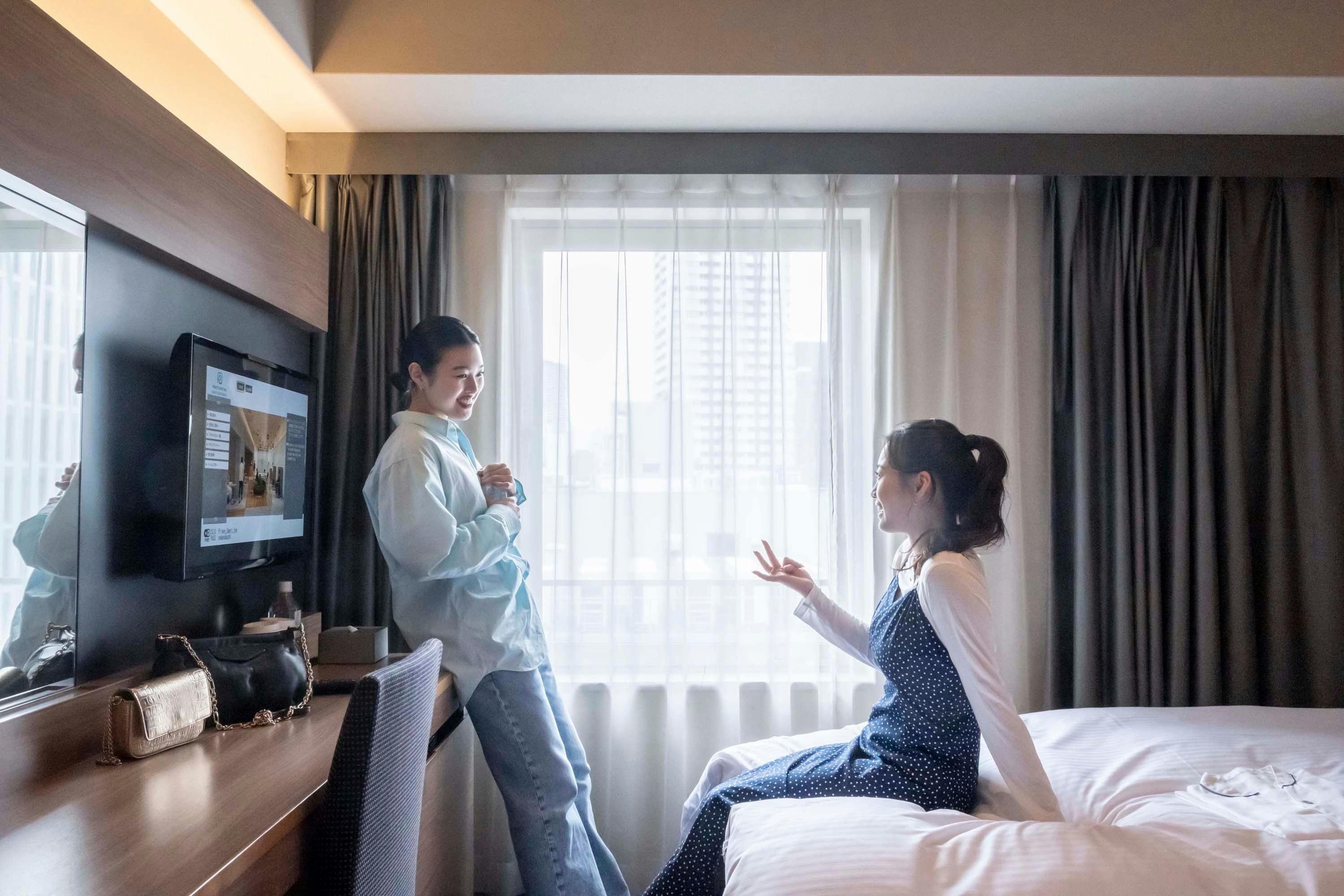 客室ではスマートスピーカーやスマートミラーを活用し、スマートな滞在をお楽しみいただけます。 客室を広く使用できるよう、ベッド下はトランクを収納出来るように高さを配慮。 クローゼットはあえて設けず、ウオールフックを採用することで開放的な空間を演出しています。 快適なプライベート空間でごゆっくりとお過ごしください。