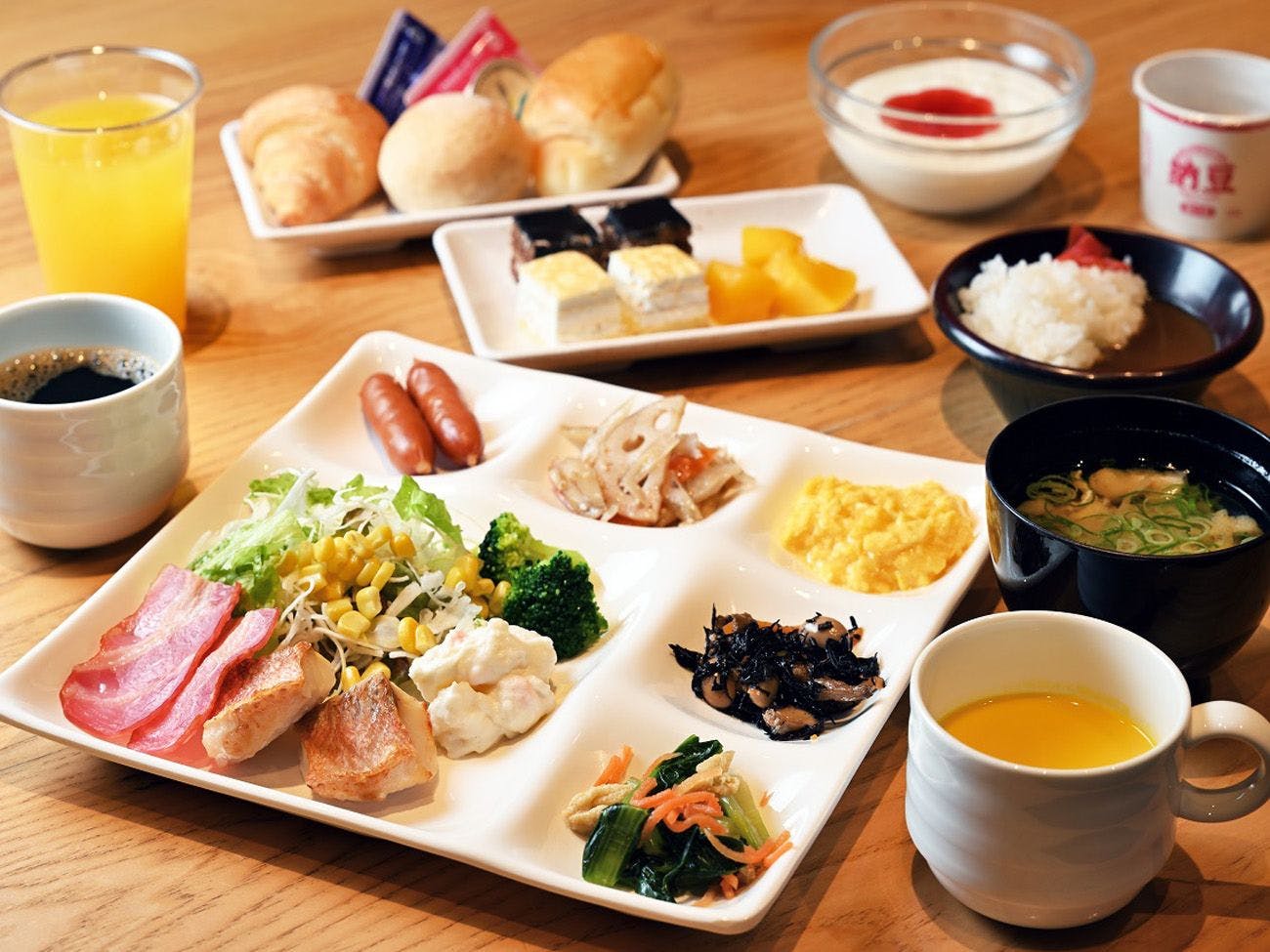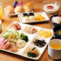(食事なしでお申し込みの方)ご宿泊者無料朝食サービス 朝食会場=地下1階会場 営業時間=7:00A.M.~10:00A.M. メニューおにぎり、味噌汁、ドリンク (テイクアウト可能) (朝食付きでお申し込みの方)和洋朝食ブッフェ 朝食会場=地下1階レストラン「黒毛和牛専門 天の幸山の幸 淀屋橋店」 営業時間=7:00A.M.~10:00A.M.(最終入店:9:30A.M.)