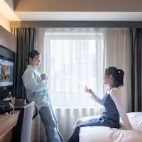 チェックインは、自動チェックイン機によるセルフチェックインになります。タッチパネルで簡単に操作が可能です。お客さまご自身でスムーズにチェックインを行い、ルームキーをお受け取りください。ご指定のお部屋に向かい、チェックインは完了。ロビーで待つことなく、すぐにお部屋でお寛ぎいただけます。
