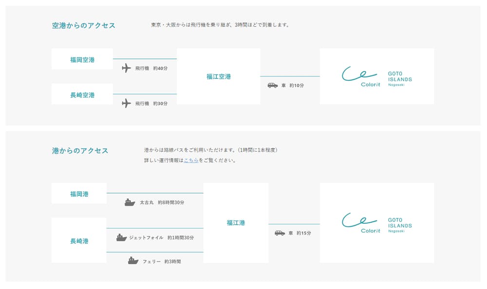 《飛行機の場合》 ・福岡空港→五島つばき空港 約40分 (ANA・JAL・ORC) ・長崎空港→五島つばき空港 約30分 (ANA・JAL・ORC) ・五島つばき空港→カラリト五島列島 車で約10分(タクシー約2,500円) 空港→福江(乗り換え)福江→大浜 乗車時間約30分(片道合計:約700円) バスをご利用の場合は、空港からの直通便がない為乗り換えが必要です。 《船の場合》 ・長崎港→福江港 (九州商船) 高速船(ジェットフォイル)約1時間30分 フェリー 約3時間 ・博多港→福江港 (フェリー太古) 深夜フェリー 約8時間 ・福江港→カラリト五島列島 車で15分(タクシー約3,000円) 福江→大浜 バスで約15分 富江行もしくは、小泊行乗車 大浜バス停より徒歩約10分 ※詳しい運行ダイヤなどは各交通機関のホームページをご参照ください。