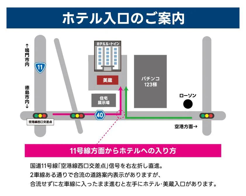 11号線から右左折後、2車線の通りで合流の道路案内表示がありますが、合流せず左車線に入ったまま進むと左手にホテル・美蔵がございます。