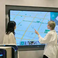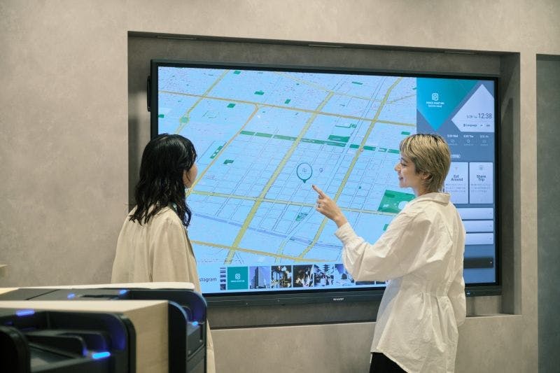 2階に位置するロビーは、シームレスな空間をイメージし、ロビーエリア、チェックインエリアが1つの空間になるようにデザインをしております。明るく広々とした空間には顔認証でのチェックインにも対応した自動チェックイン機や、付近の観光情報やグルメ情報を提供する他、お客さま同士のコミュニケーションツールとしてもご利用いただけるマップ型デジタルサイネージを設置しています。