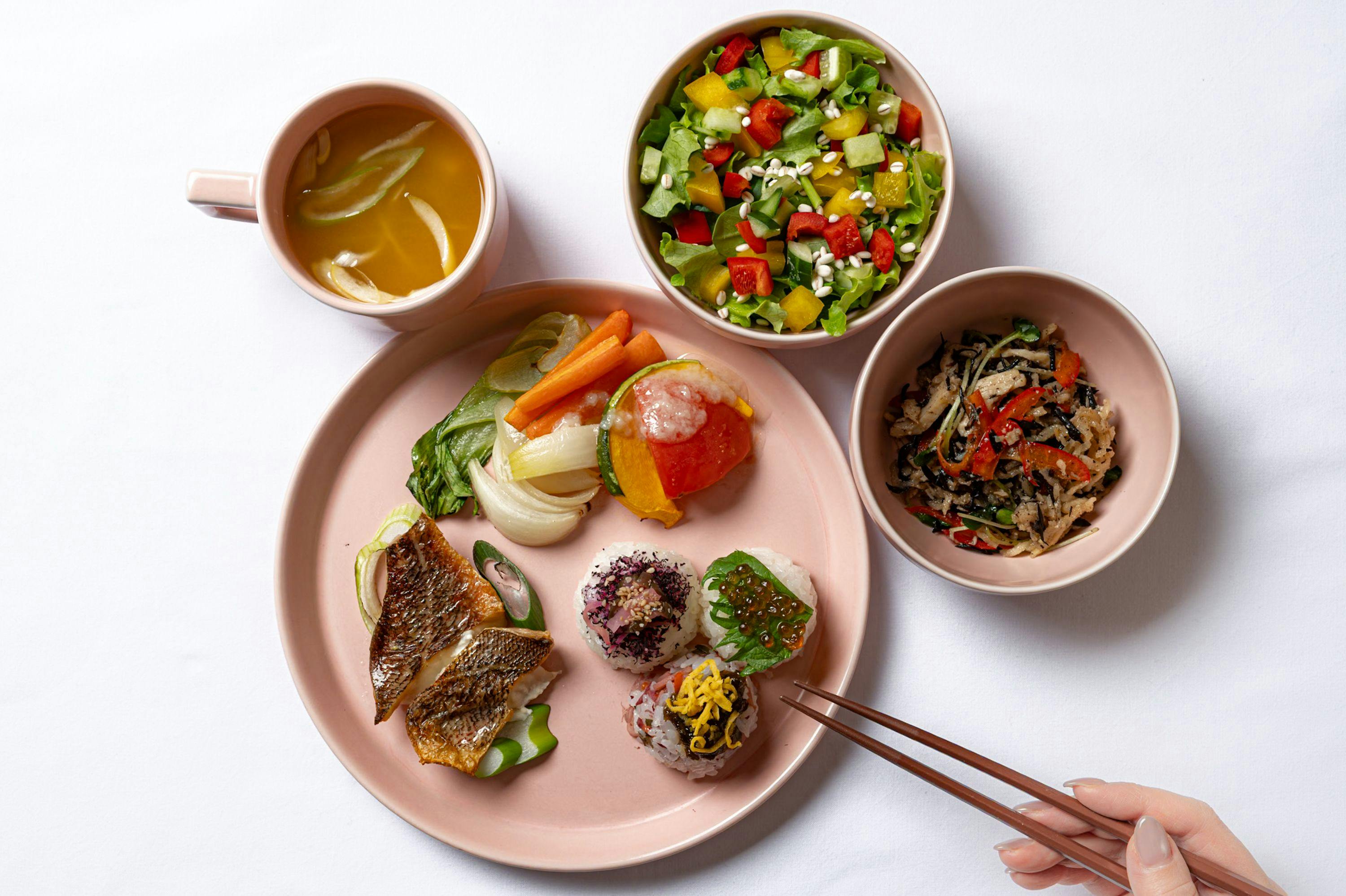 「わたし好みでつくる、一汁三菜プレート」 その日の気分に合わせて、好きなものを少しずつ。 ブッフェスタイルで選んでつくる、あなただけの一汁三菜プレートです。 主食は、おにぎりやパンから。 汁物は、一番出汁の味噌汁や、ミネストローネ。 主菜は、卵料理やチキン、旬の野菜を使用した焼き野菜。 副菜や副々菜には、野菜マリネやデリ、サラダ、フルーツなどをご用意しています。 朝食会場:14F THE BASEMENT LOUNGE 営業時間:7:00~10:00