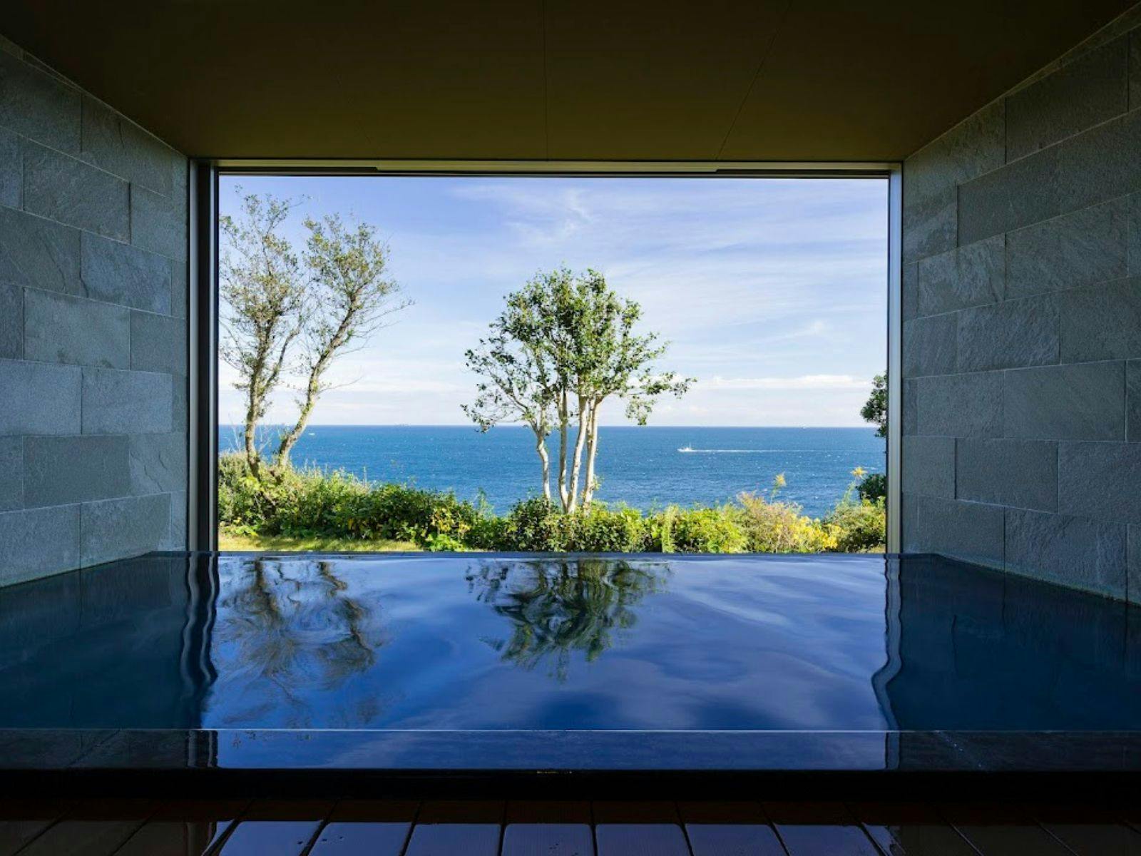This large communal bath is designed to help you feel at one with the earth, with the land extending from the tub and the sea beyond.