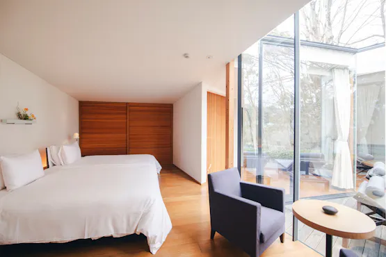 A private space with a complete reservation system offers you a deeply relaxing time for your mind and body. The simple yet elegant room features large windows that showcase the ever-changing forest scenery with each season. The only sounds are the rustling leaves in the wind and your own breath. Escape from the noise of daily life and enjoy a deeply healing experience in harmony with nature's rhythm.