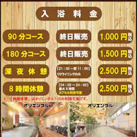 42°C high-temperature large bath, a bath that generates ultrasonic waves through bursting bubbles, vibra bath, medicinal bath, and radium spring that envelops the body in bubbles to promote metabolism. A large bath is the best way to relieve fatigue. <Fees> 90-minute course (available all day) 1,000 yen (tax included) * Includes 2 small towels * Toothbrushes, razors, scrubbing towels, and shampoo are available in the large bath area. 180-minute course (available all day) 1,500 yen (tax included) * Includes 2 small towels * Toothbrushes, razors, scrubbing towels, and shampoo are available in the large bath area. Overnight rest 2,500 yen~ (tax included) 21:00~11:00 the next day * Reclining seats only available