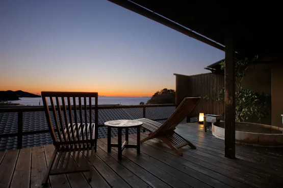 Kamar tamu Biwa adalah 8 rumah terpisah dengan desain modern Jepang yang menggunakan kayu dari rumah tradisional. Dari teras dengan pemandian air panas alami, Anda dapat menikmati pemandangan indah Teluk Suruga dan matahari terbenam.