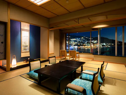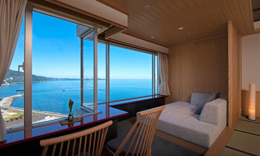 Nikmati pemandangan Teluk Sagami dan panorama malam Atami secara menyeluruh dari lantai khusus di tingkat atas.