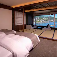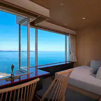 Sebuah landmark yang berdiri di tepi laut Atami, dengan deretan pohon palem yang mengesankan. Atami Korakuen Hotel adalah penginapan gaya Jepang dengan Mata air panas yang terdiri dari dua gedung: “Tower” dengan semua Kamar menghadap laut, serta “AQUA SQUAR” yang menawarkan beragam tipe Kamar dengan suasana berbeda. Daya tarik utamanya adalah lokasi istimewa dengan pemandangan menyeluruh Teluk Sagami. Di Kamar, di pemandian umum besar, maupun di restoran—sebagian besar waktu selama menginap dapat Anda nikmati ditemani panorama menakjubkan. Nikmati Mata air panas kebanggaan kami yang kaya mineral garam dan dikenal memiliki efek melembapkan kulit, secara mewah di pemandian observasi luas “Umi no Yu” yang menghadap cakrawala. Untuk pemandian wanita, tersedia ruang rias (powder room) terbuka dengan jendela kaca besar. Untuk makan malam, kami menyajikan buffet mewah menggunakan bahan-bahan pilihan dari Izu; sementara untuk tamu kamar Excellence tersedia hidangan kaiseki musiman. Nikmatilah momen relaksasi sepenuhnya, ditemani suara ombak yang menenangkan.
