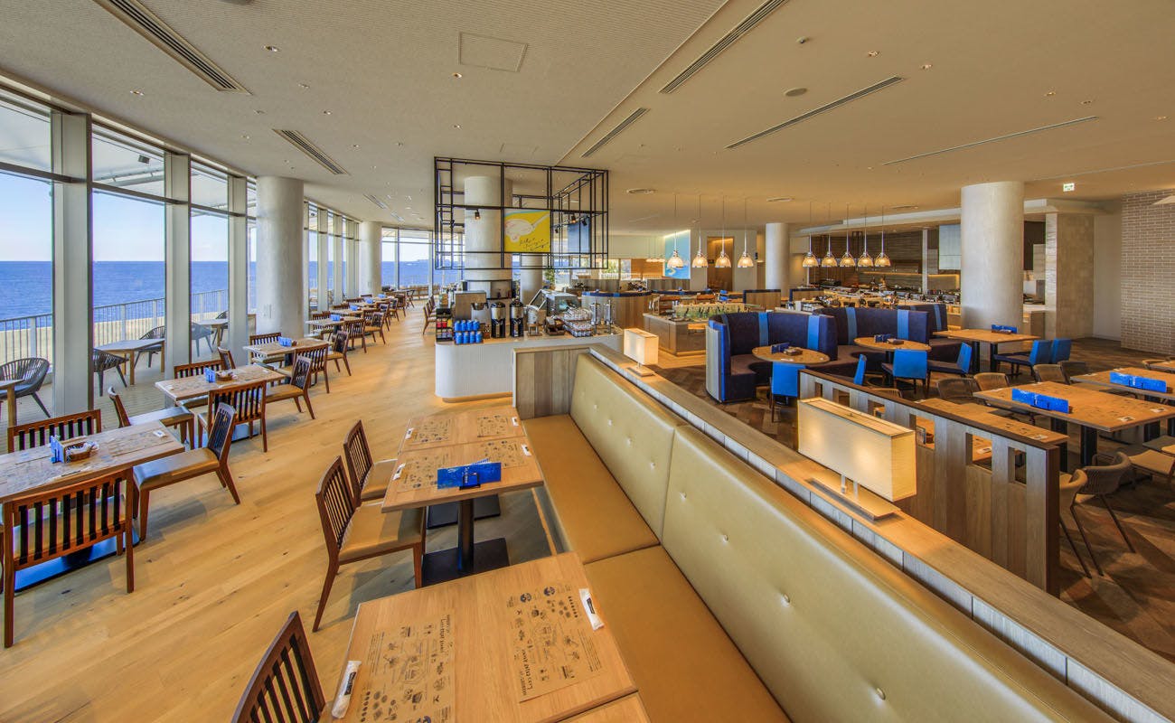 Bufet yang menggunakan beragam bahan makanan khas Izu, serta kaiseki Jepang dengan sajian musiman yang penuh warna. Nikmati hidangan pilihan kami sepuasnya. (*Kaiseki Jepang hanya tersedia bagi tamu yang menginap di Excellence Floor.)