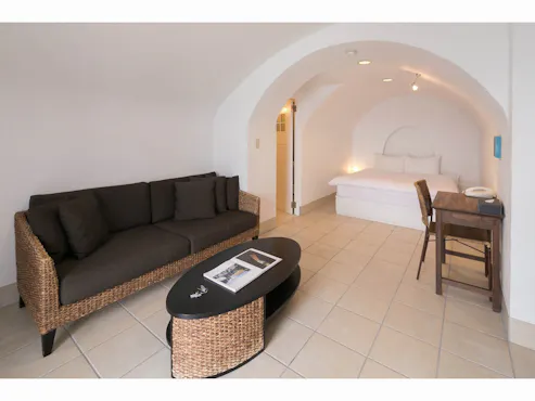 Kami mereplikasi kamar tamu dalam gaya gua yang dikatakan digunakan oleh kru kapal dagang di Pulau Santorini sebagai tempat tinggal.