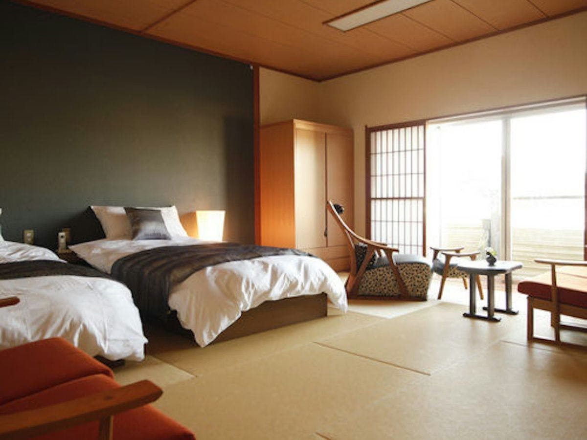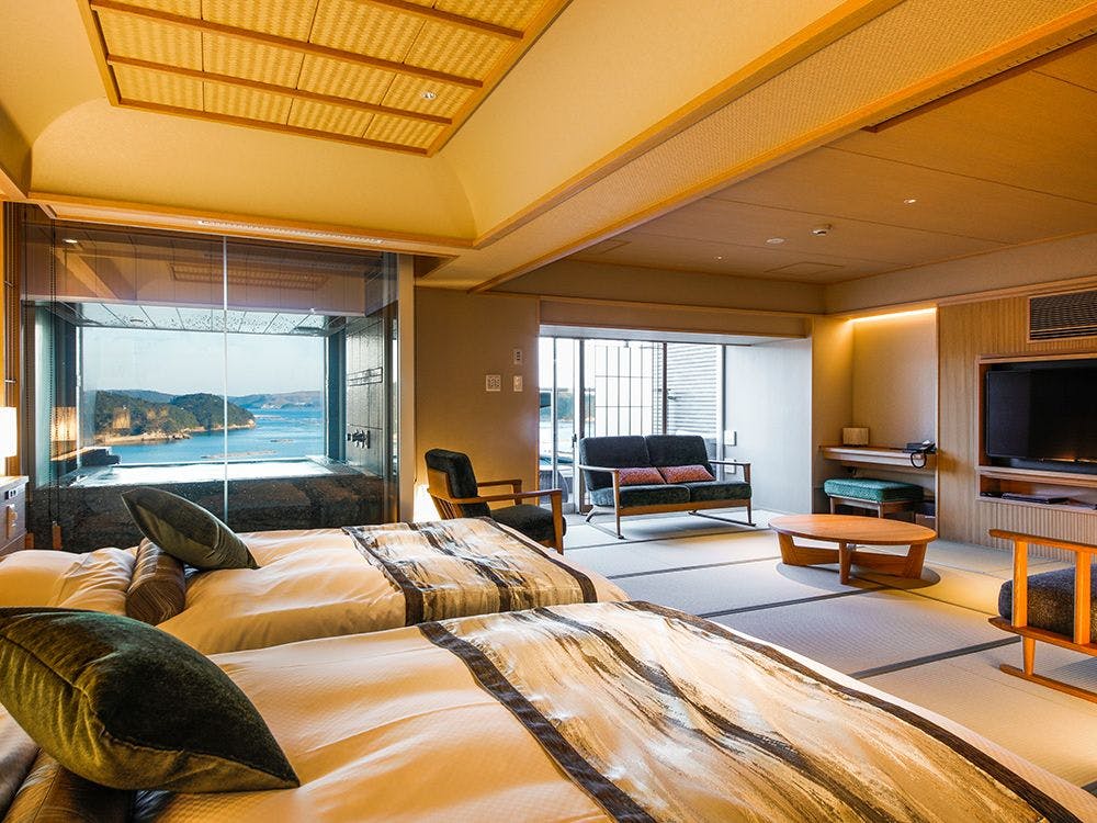Kamar-kamar yang menghadap Teluk Ikauura semuanya memiliki pemandangan laut. Nikmati berkeliling pemandian dengan dua jenis Mata air panas alami 100% dari sumbernya, masing-masing dengan suasana yang berbeda, serta sejarah penyelam ama, produk khas dan tradisi Mie, untuk menghadirkan momen perjalanan yang “menghangatkan hati”.