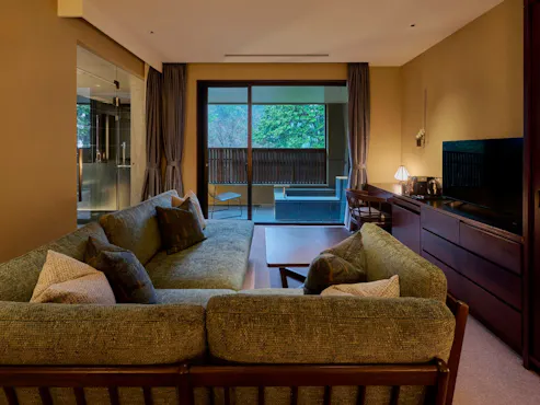 Ruang yang tenang dengan nuansa Jepang yang berpadu dengan cahaya alami, diperkaya oleh bebatuan kokoh khas Hakone serta rerumputan dan bunga-bungaan yang menghadirkan kedalaman, menjadikannya resor mewah seolah berada di tengah alam besar.