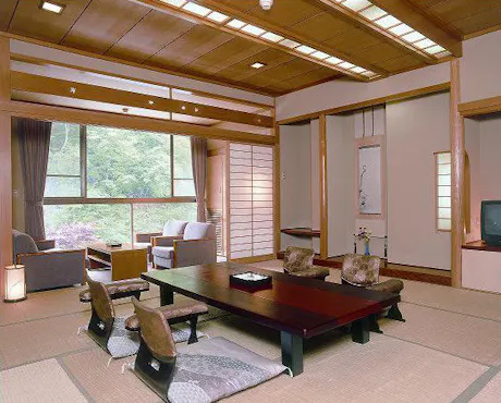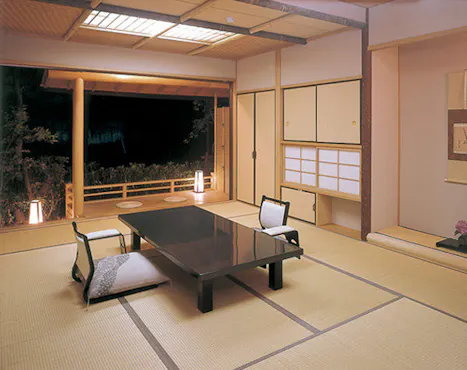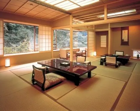 Kamar utama memiliki luas 12 tatami yang lapang, dirancang dengan gaya Jepang yang tenang dan elegan. Semua perabot yang disusun memancarkan semangat tradisional Jepang. Ruang yang luas dirancang dengan mewah dan penuh seni. Dari jendela, Anda dapat menikmati pemandangan pegunungan Kai seperti lukisan lanskap, dan dari setiap Kamar, Anda dapat melihat pemandangan indah lembah sungai Hayakawa dan Yukawa.