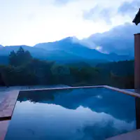 Nikmati lokasi mewah dengan Mata air panas yang memantulkan Gunung Yufu.