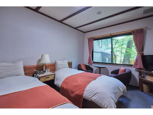 Balok langit-langit yang khas. Furnitur asli kami. 15 Kamar yang tersedia semuanya dirancang dengan unik, tidak ada dua Kamar yang sama, termasuk kamar bergaya Jepang dan Barat. Ruang yang dirancang dengan cermat ini pasti akan memberikan kesan sederhana.