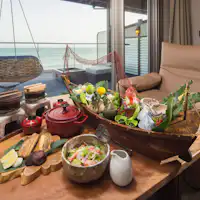 Lounge dengan kursi menghadap laut memiliki dinding penuh rak buku. Teras luar yang terhubung dengan lounge dilengkapi dengan pemandian kaki dan hammock. Nikmati kopi atau minuman pembuka gratis sambil bersantai.