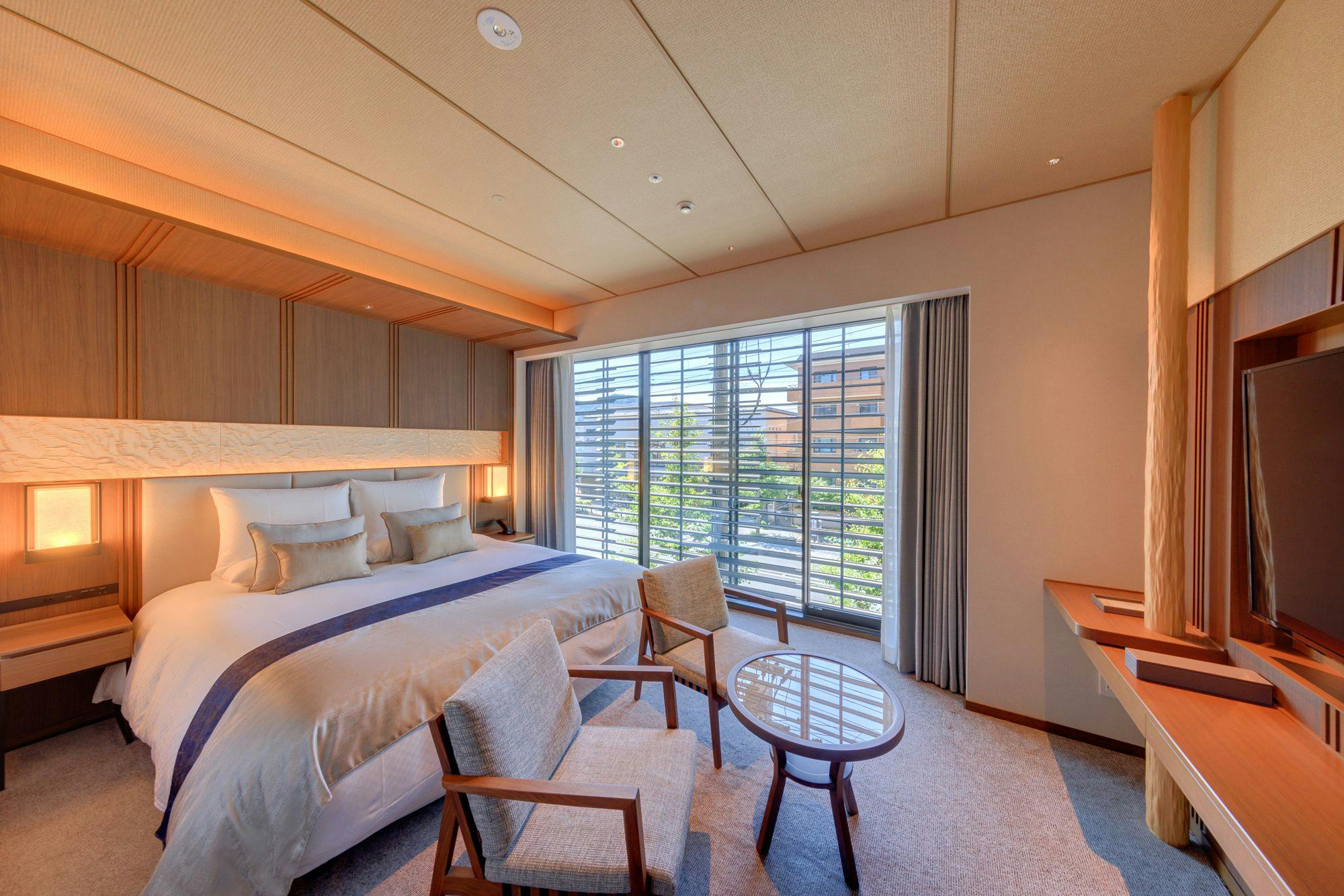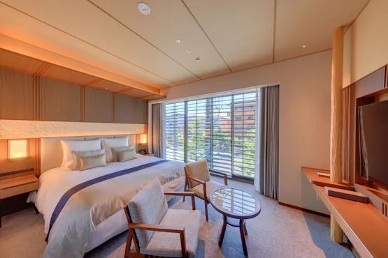 Kamar yang dirancang dengan tema vila pegunungan di Higashiyama, terdiri dari 60 Kamar. Di dalam Kamar, terdapat kain Nishijin Hoso yang ditenun untuk menggambarkan permukaan air yang tercermin dari vila ke danau, serta rak berbeda yang menggunakan tiang kayu bulat Kitayama Sugi, memberikan suasana alami dan keindahan. ※Gambar Kamar hanya untuk ilustrasi. ※Pemandangan dan lantai Kamar tidak dapat ditentukan.