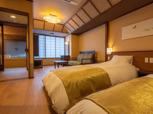Nikmati keindahan alam sambil bersantai dalam ketenangan kamar tamu bergaya Jepang. Semua kamar dilengkapi dengan bak mandi Mata air panas alami.