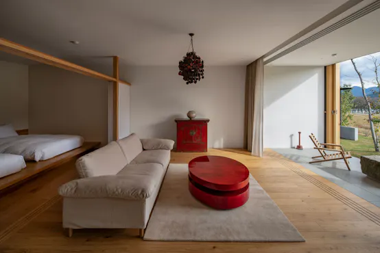 Kami menyediakan 4 akomodasi terpisah dengan nuansa yang berbeda. Setiap bangunan menggunakan kayu alami yang dikeringkan secara alami dari tema pohon masing-masing, yaitu "Cedar", "Pinus", "Chestnut", dan "Hinoki". Interiornya dirancang dengan penuh perhatian oleh empat seniman.
