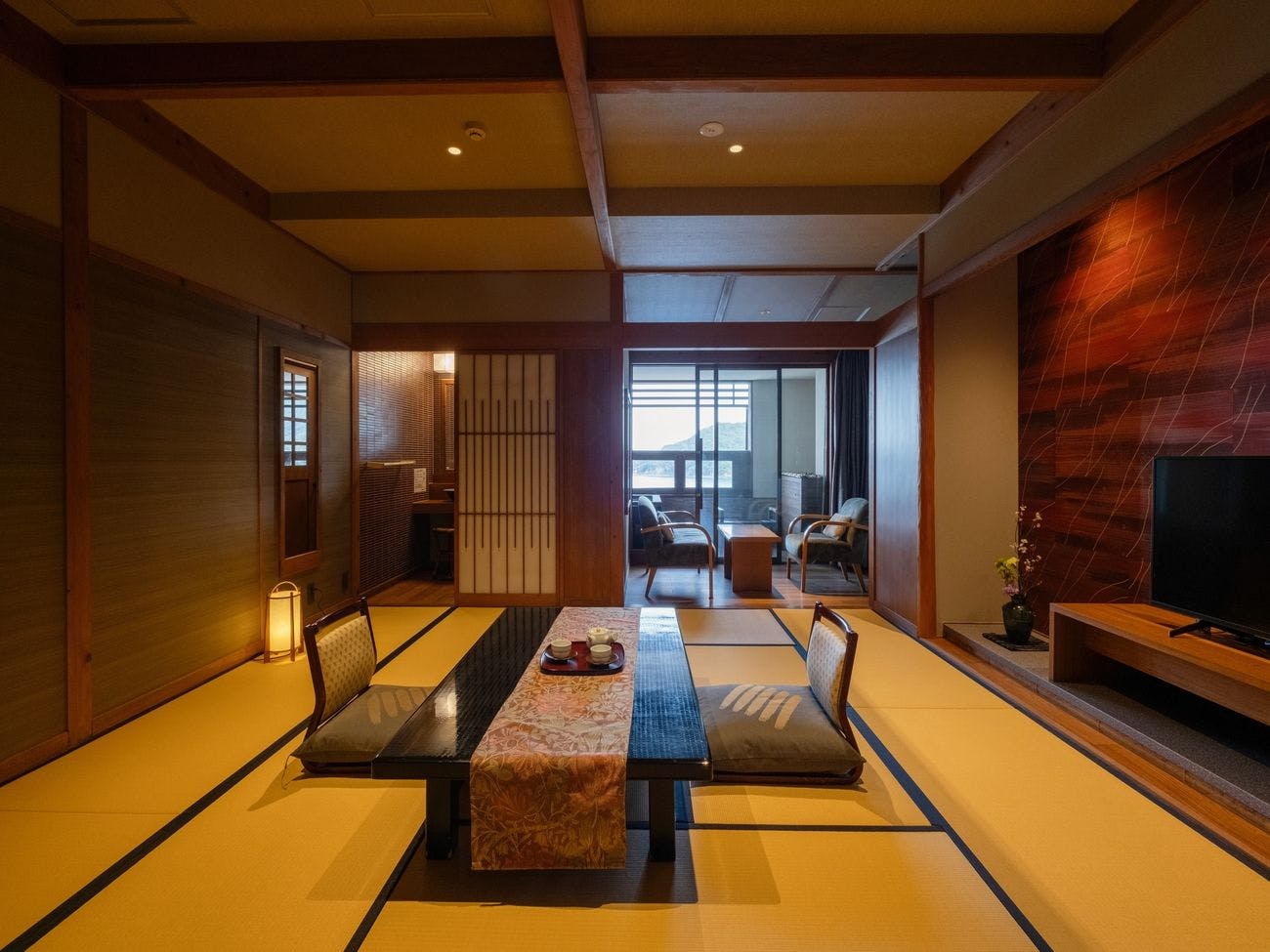 Nikmati hidangan laut segar dari Setouchi, Tomonoura, serta pemandian terbuka dengan panorama dan pemandian umum besar dengan pemandangan menakjubkan, dan bersantailah di pemandian terbuka pribadi.