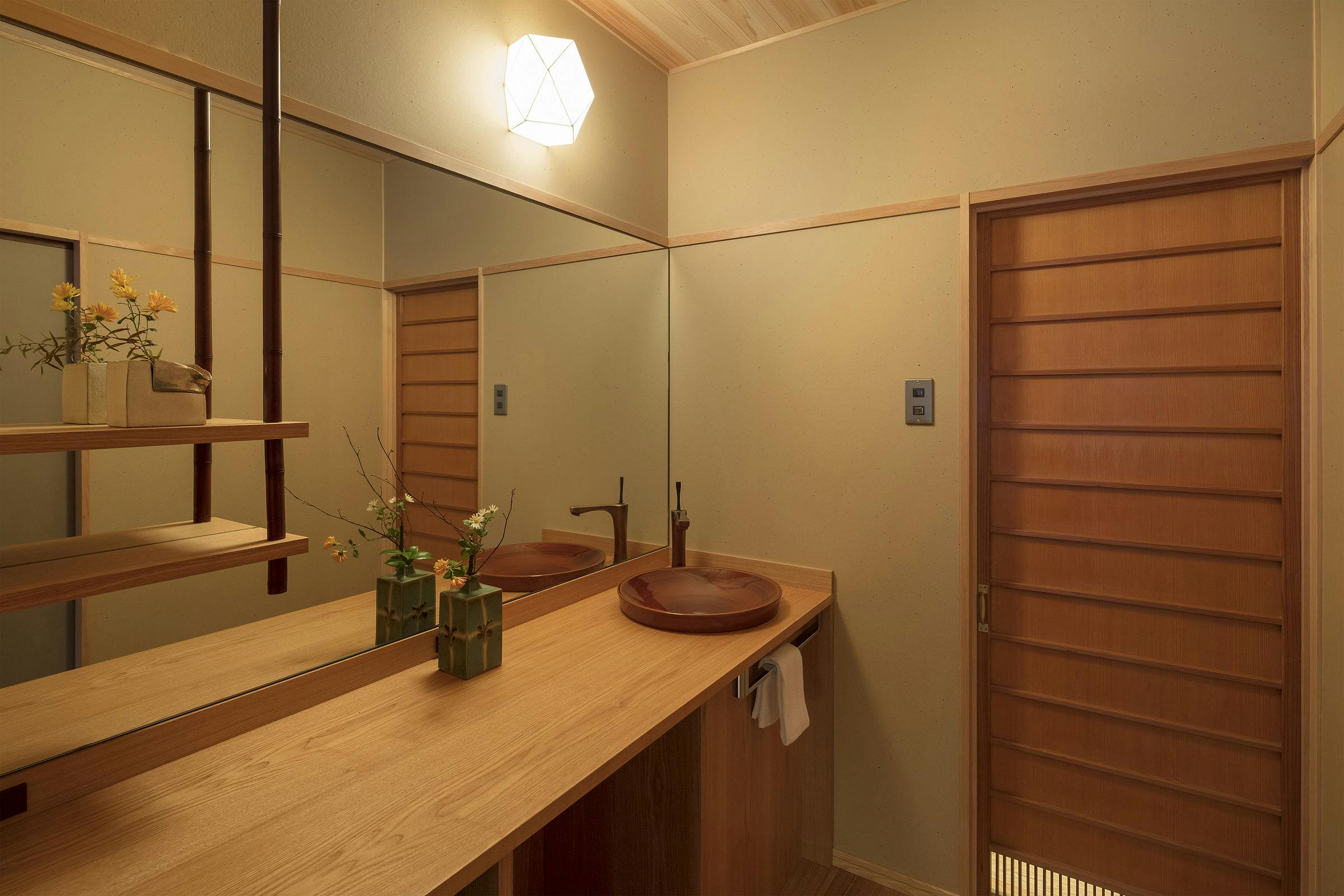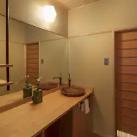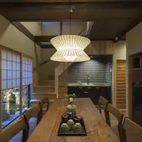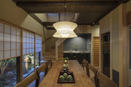 Akomodasi bergaya modern Jepang yang direnovasi dari rumah tradisional Kyomachiya, hanya 5 menit berjalan kaki dari Stasiun Kyoto. Akomodasi ini adalah sewa satu bangunan penuh dengan batasan satu grup per hari. Di lantai pertama terdapat ruang tamu dan ruang makan dengan pemandangan taman kecil (tsuboniwa) serta kamar bergaya Jepang. Di lantai kedua, terdapat kamar bergaya Barat dan kamar bergaya Jepang yang menampilkan balok kayu tua, memberikan nuansa khas rumah Kyomachiya. Terdapat dua toilet dan dua wastafel, sehingga nyaman untuk grup besar. Dari kamar mandi, Anda juga dapat menikmati pemandangan taman kecil. Di area langit-langit tinggi, terdapat lampu besar yang dibuat dari logam antik dan obi (sabuk kimono) yang indah, sementara dinding kamar bergaya Jepang dihiasi dengan warna-warna tradisional Jepang yang cerah untuk menciptakan suasana yang elegan. Dapur dengan kompor IH dan area kamar mandi telah diperbarui untuk kemudahan penggunaan. Kyomachiya ini sangat cocok untuk perjalanan bersama pasangan, keluarga, atau teman.