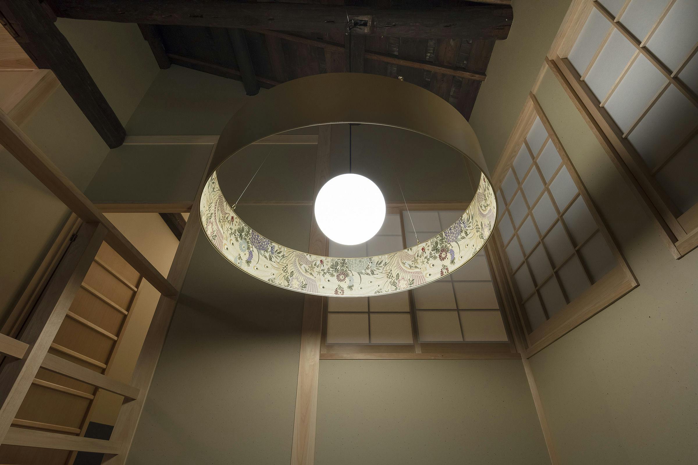 Kami mendaur ulang kimono Nishijin-ori yang diwariskan dari generasi ke generasi menjadi pencahayaan dan bantal duduk. Interior dihiasi dengan teknik "Hikihaku" yang telah diasah dalam seni Nishijin-ori. Kain tenun yang indah ini kembali bersinar, mempercantik rumah kota yang telah direvitalisasi.