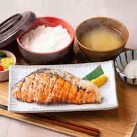 Set menu ikan panggang + pilih 3 jenis lauk kecil. - Set Saba Panggang Garam - Set Salmon Panggang Garam - Set Aji Panggang Terbuka - 3 Jenis Lauk Kecil (Tuna Segar, Natto, Mentaiko, Matsumaezuke, Shirasu Rebus, Yamagata Dashi, dll.) Pukul: 07.00–10.00 (L.O 09.30) Harga (termasuk pajak): Pemesanan Awal Rp1.500 / Hari-H Rp1.700