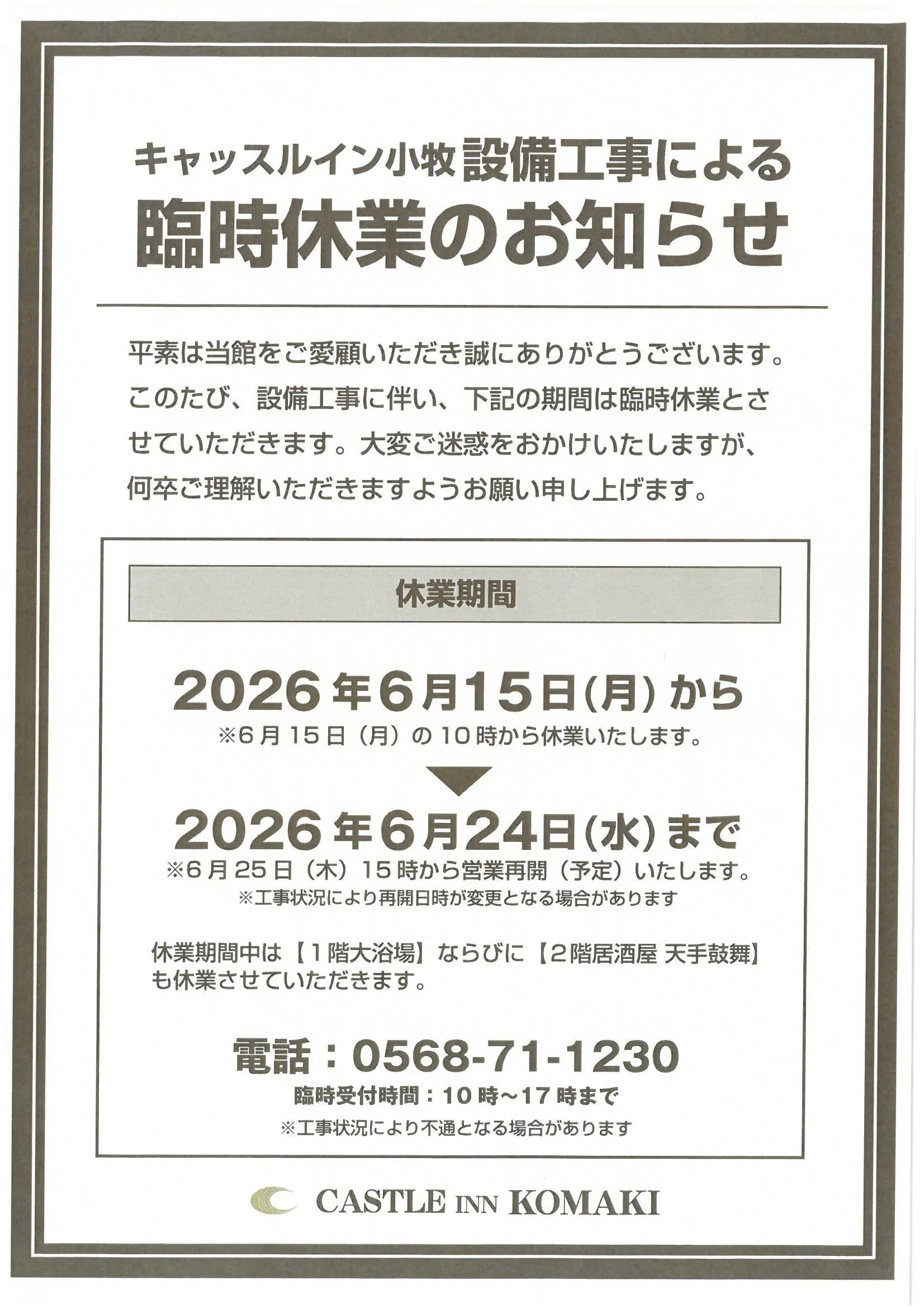 Karena pekerjaan instalasi Fasilitas, kami akan tutup sementara pada tanggal berikut.