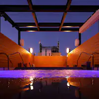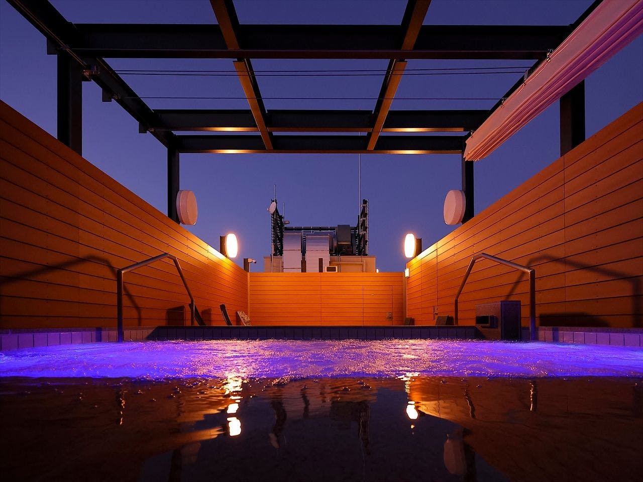 Deskripsi area rooftop. Terdapat tangga menuju area observasi di rooftop: - Sauna Finlandia (dengan opsi self-löyly) - Sauna garam (sauna garam hybrid dengan garam alami dan keramik Shigaraki) - Area relaksasi udara terbuka - Dua jenis kolam air dingin (14°C & 20°C) - Pemandian keramik Shigaraki dengan air alami *Catatan tentang hari pembersihan sauna* Pembersihan seluruh fasilitas sauna dilakukan setiap hari Senin. Jika hari Senin adalah hari libur nasional, pembersihan akan dilakukan pada keesokan harinya.