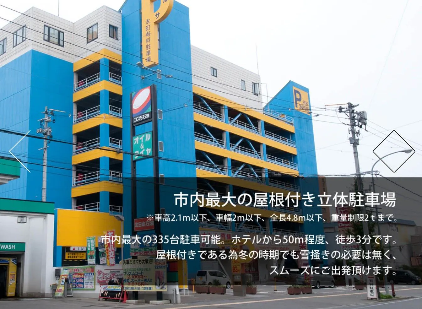 Area parkir terbesar di kota dengan kapasitas 335 kendaraan. Dari Hotel ke area parkir sekitar 50m, memakan waktu sekitar 3 menit berjalan kaki. Dengan atap, tidak perlu membersihkan salju di musim dingin, memudahkan keberangkatan. ※ Tinggi kendaraan di bawah 2,1m, lebar di bawah 2m, panjang di bawah 4,8m, berat maksimum 2 ton.