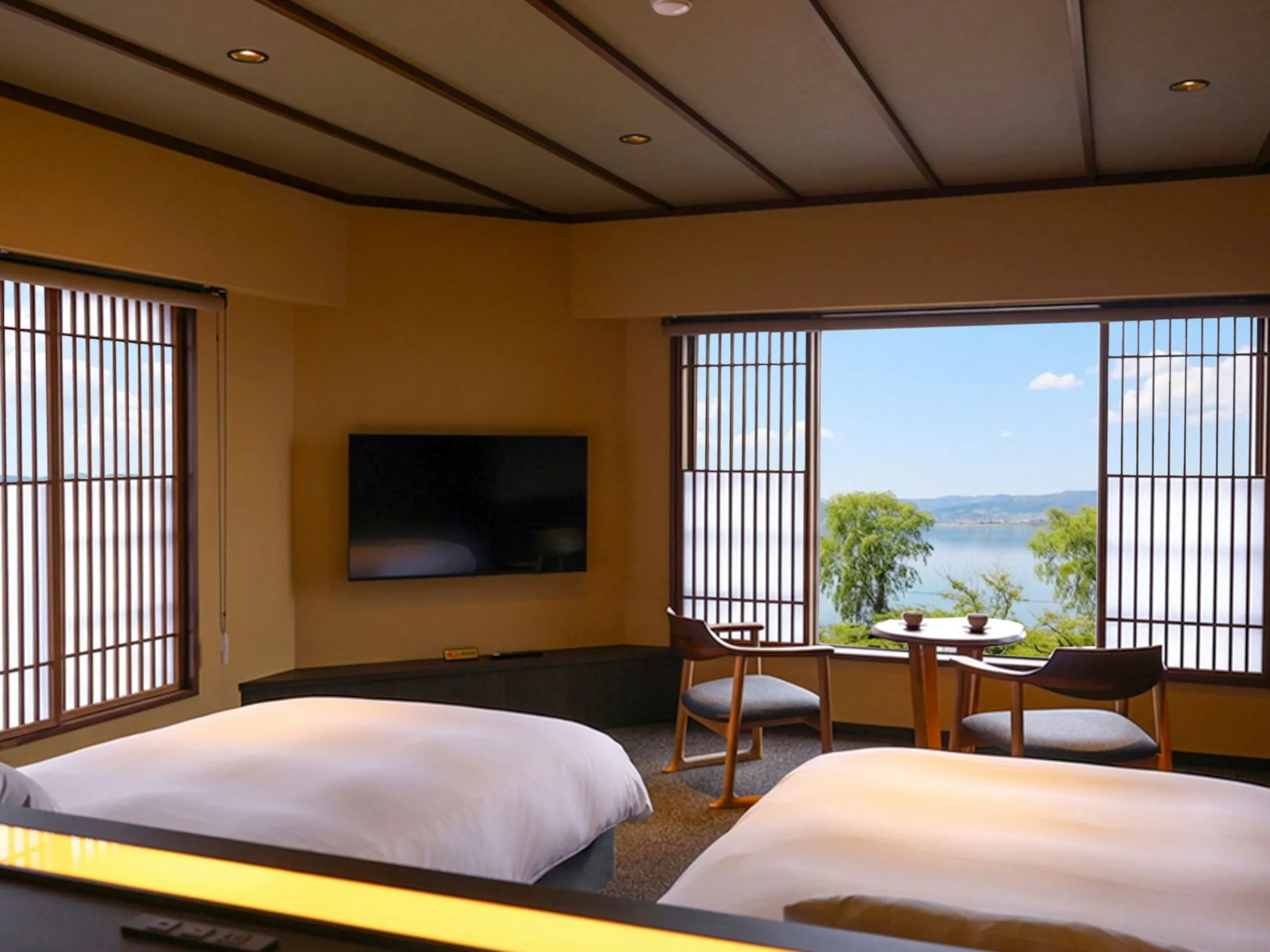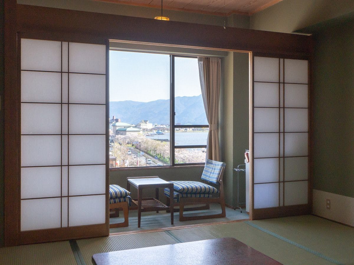 Kamar yang menghadap Danau Suwa dengan pemandian panorama Mata air panas. Bak mandi di dalam Kamar dapat menjadi semi terbuka saat jendela dibuka. Sambil menikmati pemandangan Danau Suwa dari arah diagonal, Anda dapat bersantai menikmati Mata air panas.