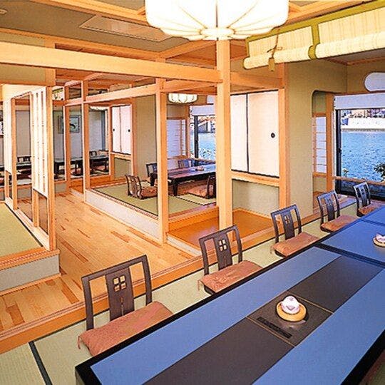 <1F Restoran Tradisional Hanakagari> Pemandangan empat musim di Inuyama dan pantulan di permukaan air. Nikmati hidangan dalam suasana tenang dan harmonis. Tempat duduk dirancang dengan gaya tradisional untuk kenyamanan. Pintu masuk Hanakagari telah direnovasi pada Juni 2021.