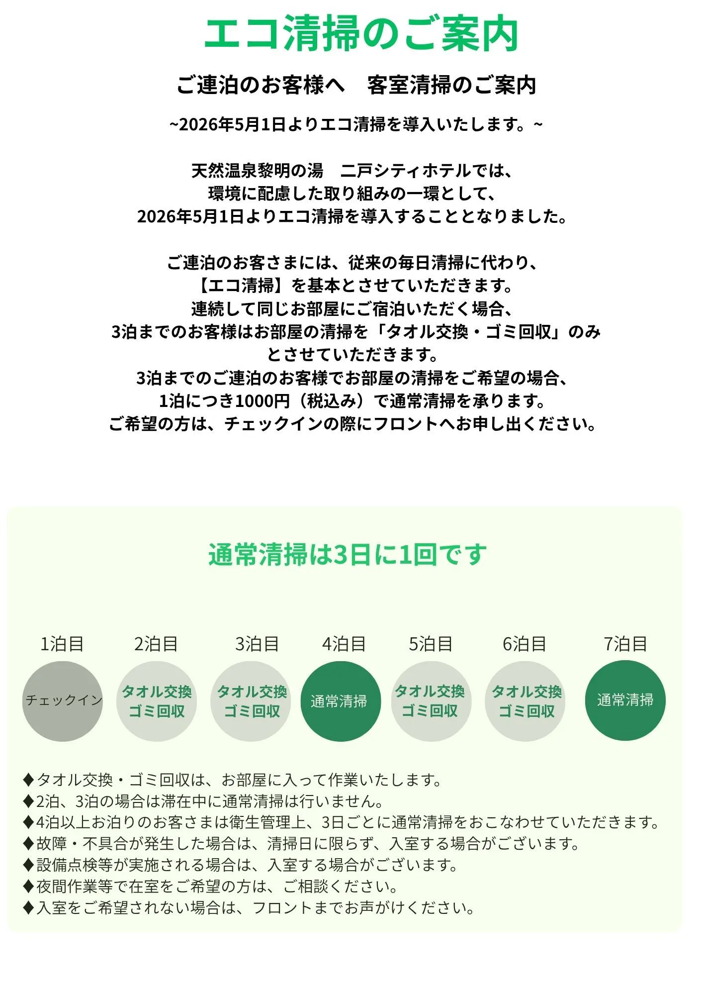 Untuk tamu yang menginap Malam berturut-turut ~Mulai Mei 2026, kami akan menerapkan layanan pembersihan ramah lingkungan~