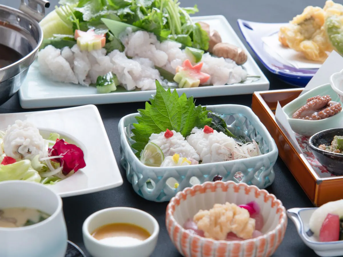 Kami menyiapkan hidangan kaiseki andalan penginapan kami yang serba hamo,