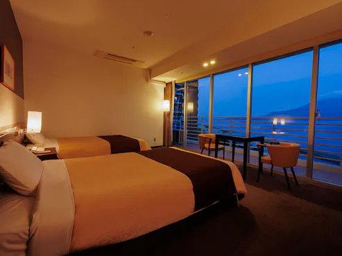 Semua kamar menghadap laut. Nikmati pemandangan megah Gunung Sakurajima dan Teluk Kinko yang tenang, menjanjikan waktu yang nyaman untuk Anda.