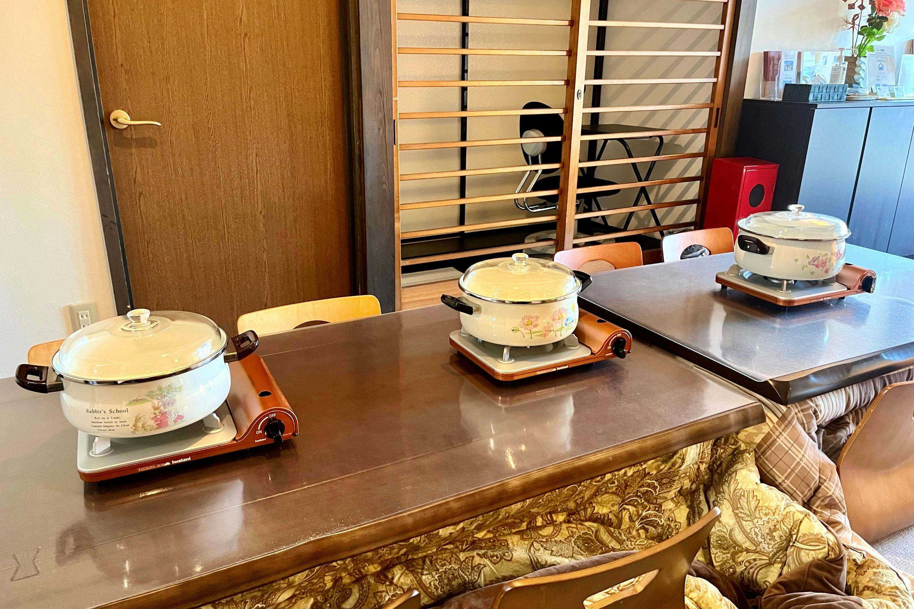 Karena ini adalah Akomodasi sewa penuh yang nyaman untuk rombongan besar, kami menyediakan dapur dan ruang makan yang ideal untuk menikmati hidangan hot pot. Hot pot yang dibuat bersama sambil mengelilingi bahan-bahan akan menciptakan momen makan yang istimewa, di mana percakapan mengalir dengan alami. Mengapa tidak sejenak menjauh dari rutinitas pekerjaan rumah dan menikmati memasak bersama? Tidak hanya di musim dingin, berkat fasilitas AC Anda dapat menikmati hot pot kapan pun sepanjang tahun.