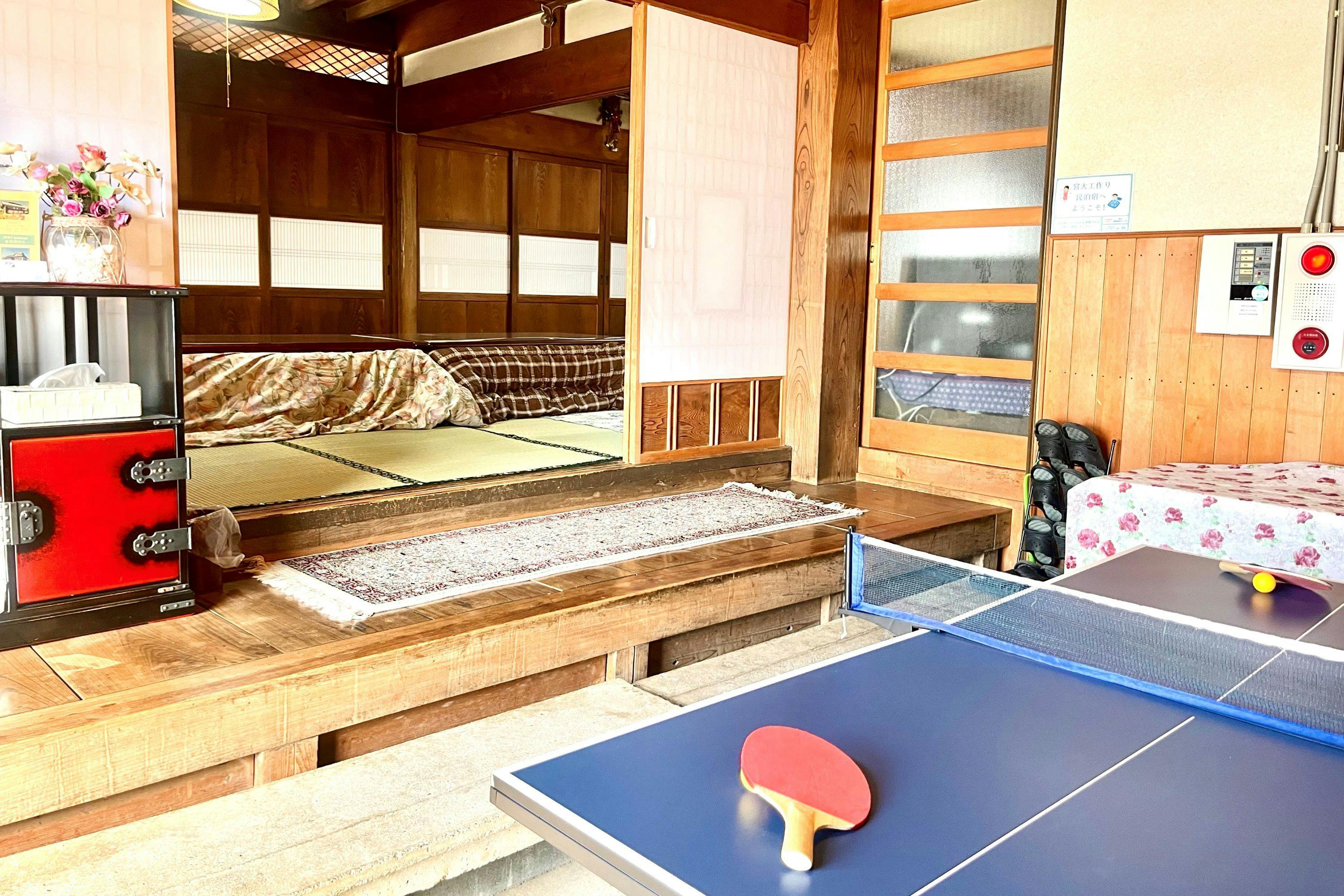 Liburan pribadi di lantai 1 Kiyomizu-tei & teras. Boleh membawa makanan/minuman sendiri; peralatan BBQ gas dan pesta hot pot dipinjamkan gratis. Rumah besar bersejarah di pusat kota kastil yang tenang, dikelilingi taman dan ruang hijau, telah direnovasi untuk perjalanan grup. Keramahtamahan hangat khas usaha keluarga menjadi daya tariknya. Tersedia aula besar 50 tatami, ruang makan bergaya retro era Showa, serta area doma dengan meja tenis. Kamar tidur dapat diatur fleksibel. Hanya 1 grup per hari, sehingga Anda bisa bersantai tanpa khawatir sekitar. Kayu berkualitas tinggi yang dipanen dari Gunma Jomo Sanzan menenangkan tubuh dan pikiran Anda. Di sekitar juga terdapat banyak Mata air panas untuk kunjungan sehari—ideal sebagai basis wisata. Takasaki, Maebashi, Ikaho, dan Haruna sekitar 25 menit dengan mobil. Sekitar 25 menit berkendara dari Maebashi IC, dan sekitar 27 menit dengan bus atau mobil dari Stasiun JR Takasaki. Kapasitas hingga 20 tamu.