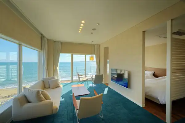 Suite eksklusif ini dirancang dengan karpet biru yang luas di ruang tamu, kaca patri berbentuk kerang, dan pemandangan dari jendela yang menciptakan suasana seperti berada di alam.