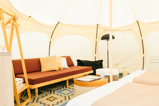 Malam hari, nikmati dunia yang luar biasa dengan nyala api yang berkilauan dan langit penuh bintang. Di tengah keheningan alam, waktu berbincang di sekitar api unggun adalah kemewahan "tidak melakukan apa-apa" yang tidak bisa dirasakan dalam kehidupan sehari-hari. Kata-kata yang mengalir secara alami maupun keheningan yang nyaman, semuanya larut bersama suara kayu terbakar. Ini adalah tempat di mana Anda bisa menjadi diri sendiri sepenuhnya. Agar Anda lebih menikmati suasana api unggun, bar outdoor dekat perapian menyediakan minuman khas untuk melengkapi pengalaman ini. Selain itu, s'mores (marshmallow panggang) juga menjadi favorit untuk menambah suasana glamping Anda. Nikmati waktu istimewa yang tidak dapat ditemukan di tengah kota!