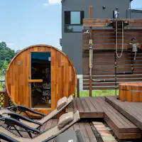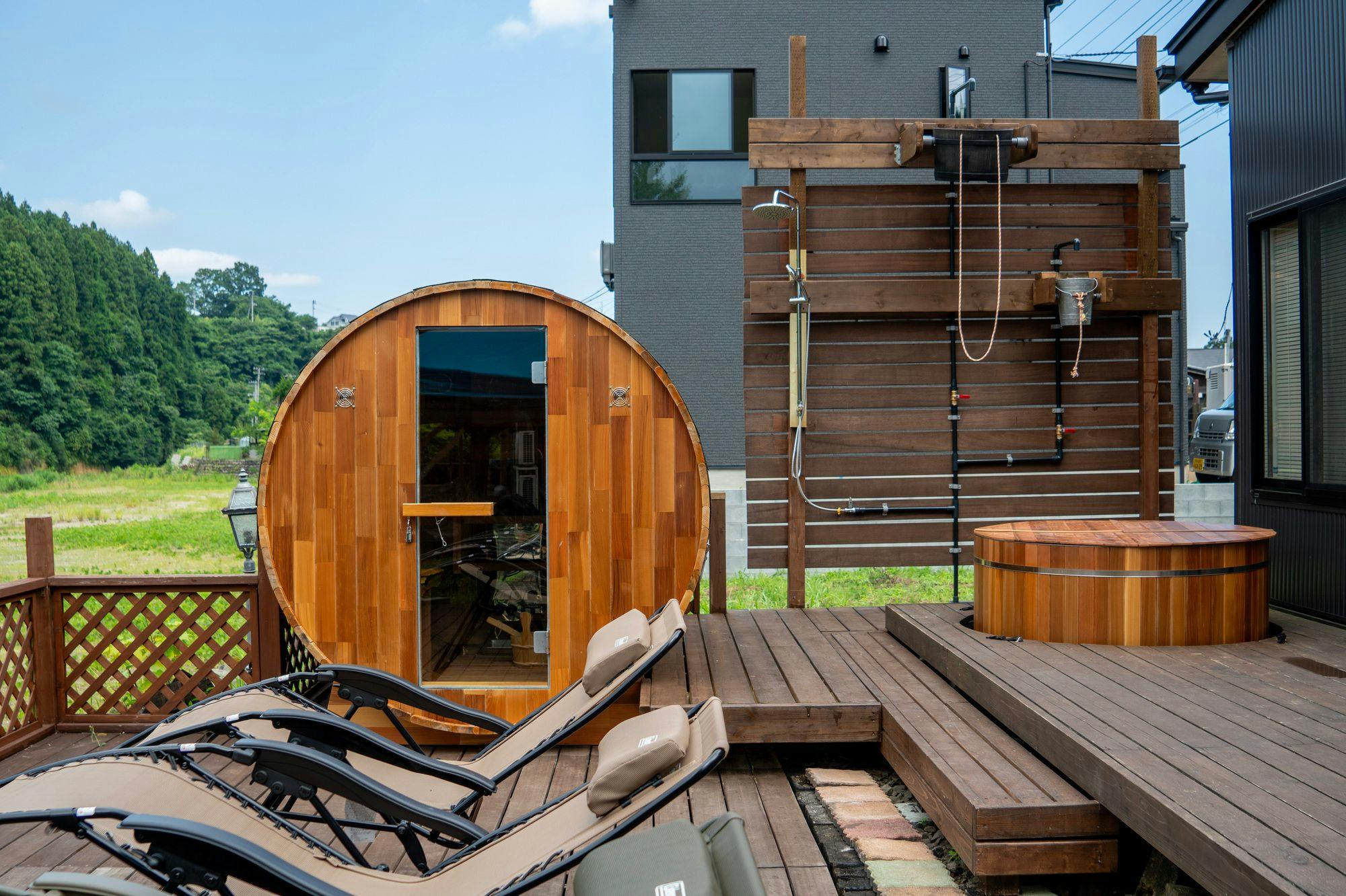 Ini adalah sauna barrel yang dapat menampung hingga 4 orang. Tersedia juga bak mandi berpendingin (chiller) yang dapat menurunkan suhu hingga level single (di bawah 10°C). Kami juga menyediakan kursi reclining yang ideal untuk bersantai di udara luar, silakan digunakan. 【Jam penggunaan】08:00–20:00