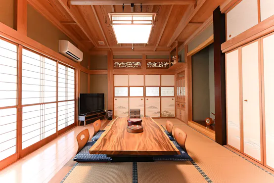 Saat melangkah masuk ke dalam penginapan gaya Jepang, Anda akan langsung disambut oleh pintu masuk yang luas dan megah. Langit-langit tinggi dihiasi dengan plafon kotak hasil karya tangan para pengrajin, sementara rumah ini dibangun sepenuhnya menggunakan kayu solid seperti kayu keyaki dan tiang utama dari kayu cendana. Anda dapat menikmati suasana tradisional Jepang yang mewah seolah-olah sedang menginap di penginapan kelas atas.