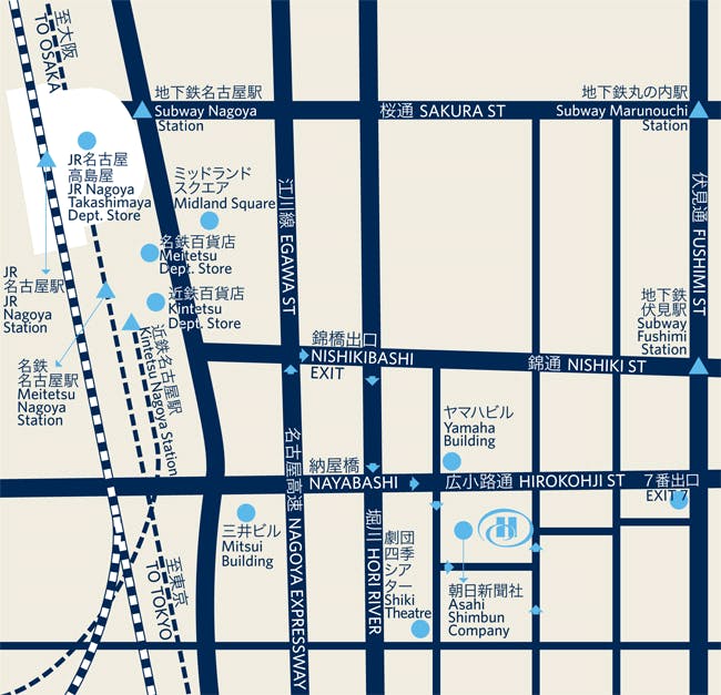 토메이고속도로 나고야IC에서 나고야 고속도로로 환승 후 도시순환노선 "니시키바시" 출구에서부터 차량으로 약 3분 소요됩니다.