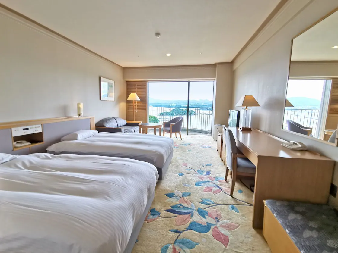 넓은 45㎡, 현관에 들어서면 냉장고, 옷장, 화장실이 있으며, 욕실과 세면대, 화장실이 독립적으로 설계되어 사용이 편리합니다. 또 하나의 문을 열면 넓은 침실이 있습니다. 큰 창문이 있으며, 그 너머로 아름다운 바다와 하늘이 펼쳐집니다. ※이 객실은 금연실입니다.
