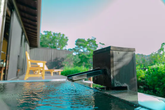 비와 객실은 고택의 목재로 만들어진 일본식 모던 스타일을 기본으로 한 8개의 독립된 별채입니다. 온천수가 흐르는 노천탕이 있는 테라스에서는 스루가만과 석양의 절경을 감상할 수 있습니다.
