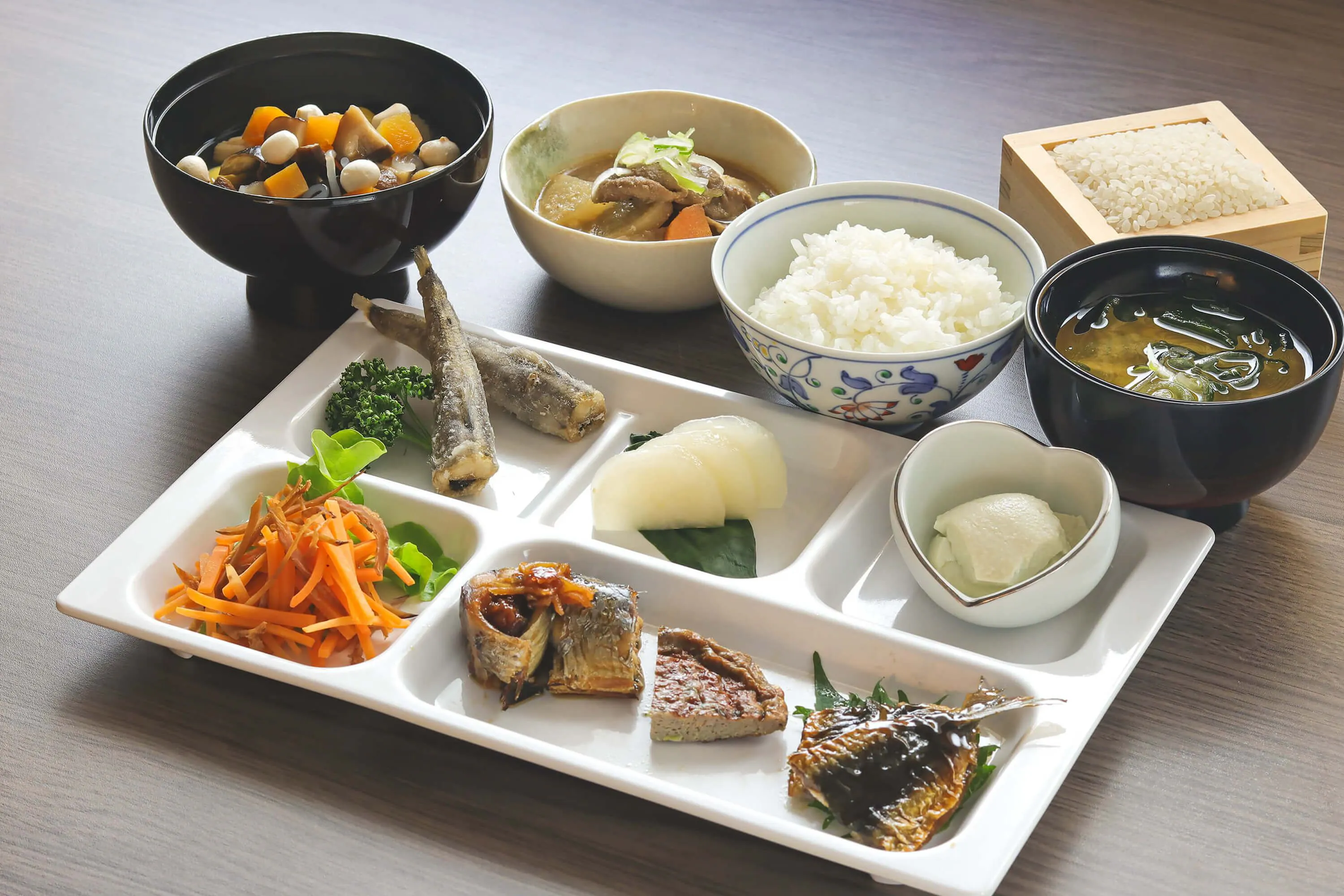 오야시오와 구로시오가 만나는 후쿠시마현 앞바다의 풍부한 어장에서 잡힌 ‘조반모노’(메히카리 튀김, 정어리 매실 조림·데리야키)를 제공해 드립니다. 아이즈 지방 특유의 ‘발효 문화’(산고하치 절임, 된장 절임, 아이즈 시골 된장 미소된장국)도 꼭 맛보세요. 그 밖에도 아이즈의 향토 요리 ‘코즈유’와 ‘꽁치 포포야키’ 등 후쿠시마현의 깊이 있는 식문화를 아침부터 마음껏 즐기실 수 있습니다.