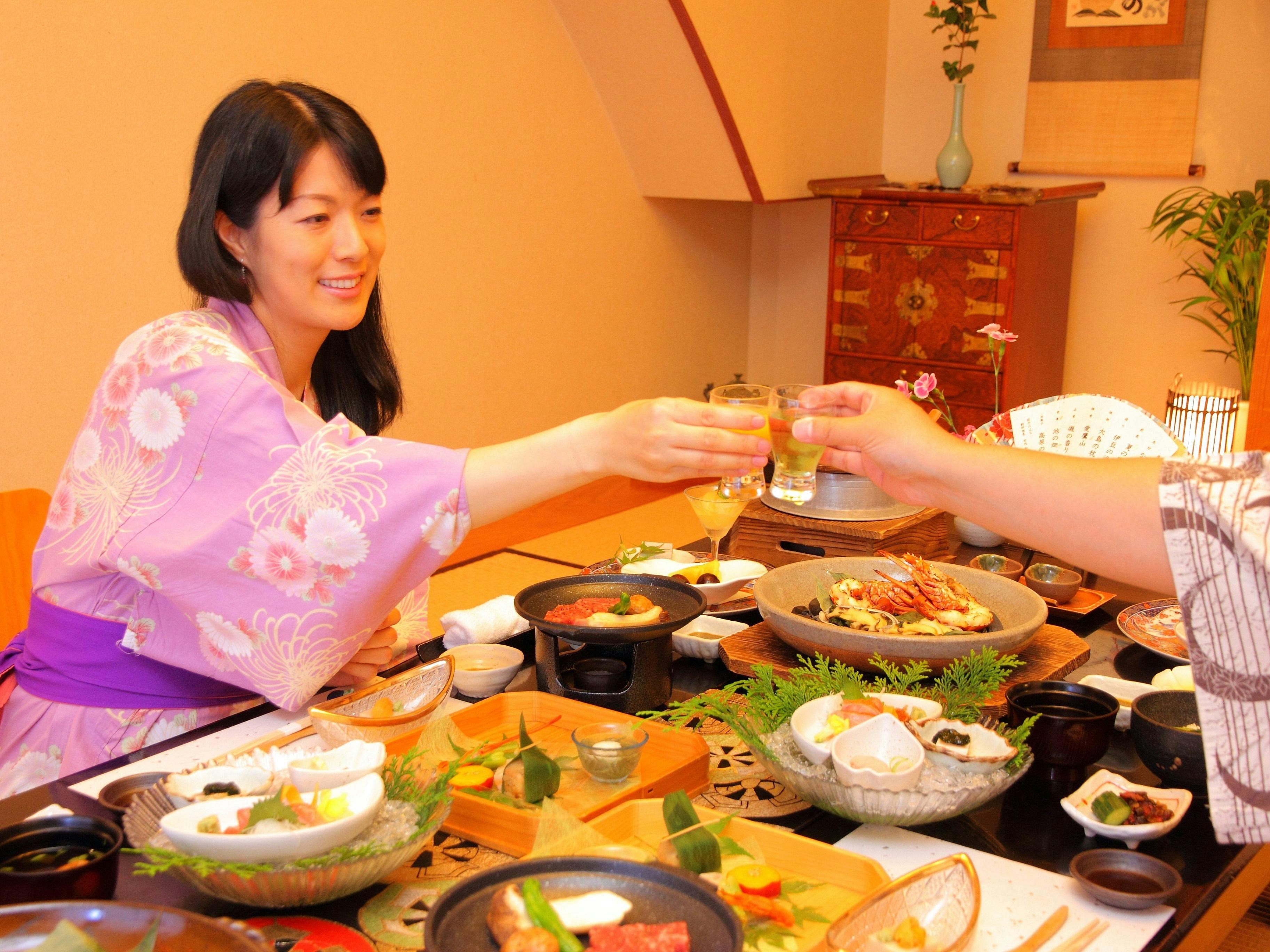 이즈에 오신다면, 이즈의 식재료를 마음껏 맛볼 수 있는 식사를 즐겨보세요. 저녁 식사로는 이즈의 3대 식재료인 '이세새우, 긴메다이, 시즈오카산 아시타카 소고기'를 중심으로 한 창작 일본식 가이세키 요리를 만끽하실 수 있습니다.