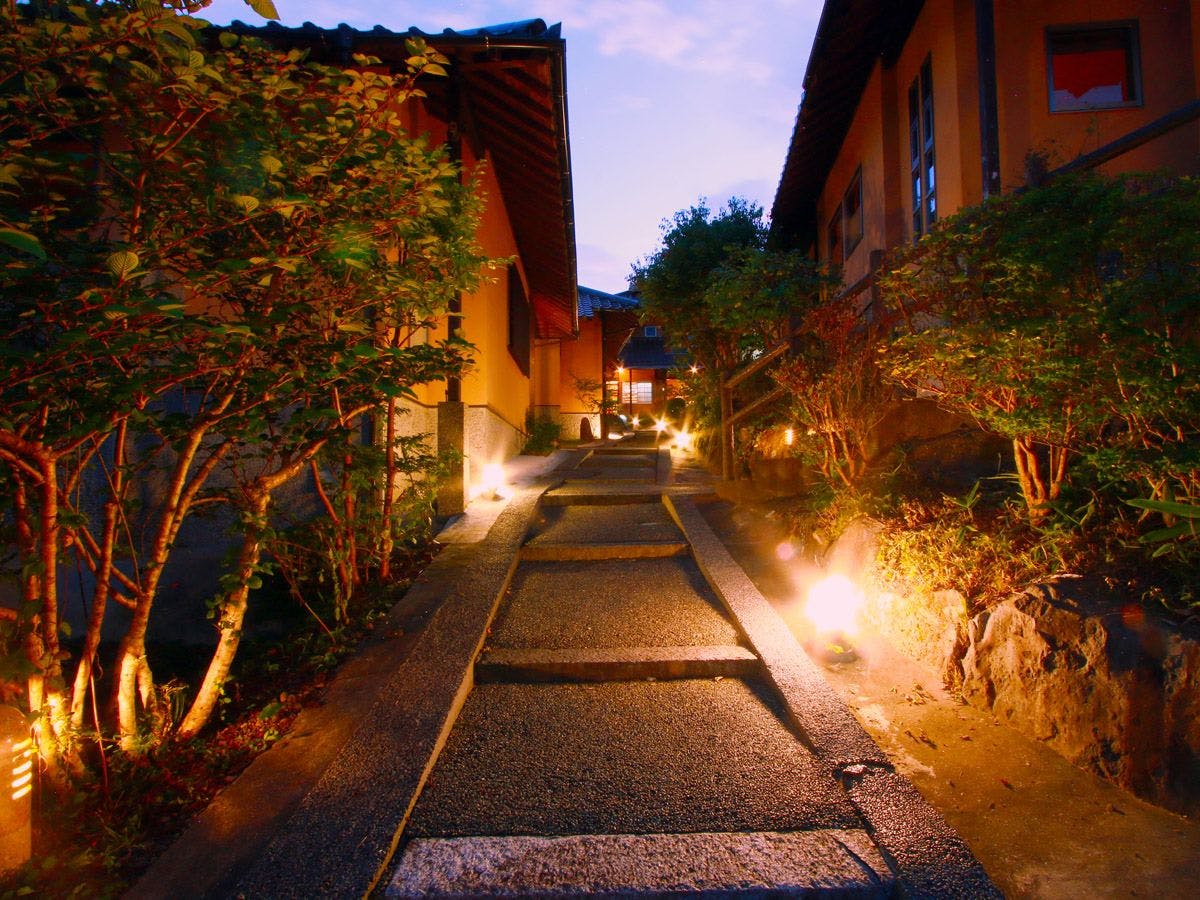 별채 8동. 모든 객실에는 노천탕과 실내탕이 완비되어 있습니다. 별채 객실만의 고요함 속에서 마음껏 힐링의 시간을 만끽해 보세요. 유노히라의 풍부한 자연과 어우러져 조용히 자리 잡은 안락한 공간은 여유와 고요함으로 호화로운 시간을 연출합니다.